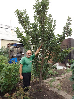На фотографии садовод-опытник из пермского края Сергей Иванович Беклимышев с урожаем сезона 2012 года, о чем свидетельствует дата. На заднем плане колоновидные яблони. Как видите, с неплохим урожаем. Да! А какой урожай на столе? Чудо!