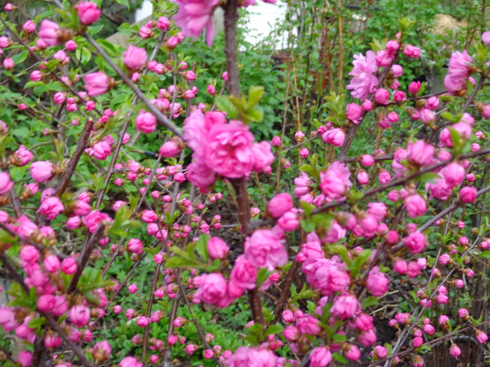 Оживая, сакура покрывается множеством розовых шариков, при этом нет еще ни намека на зелень листочков. Медленно набирая насыщенный цвет и объём, они постепенно делают невидимыми ветви куста, и однажды замечаешь, что уже и листочки развернулись. Их форма необычно рельефна, а пластинка напоминает жатый шёлк.