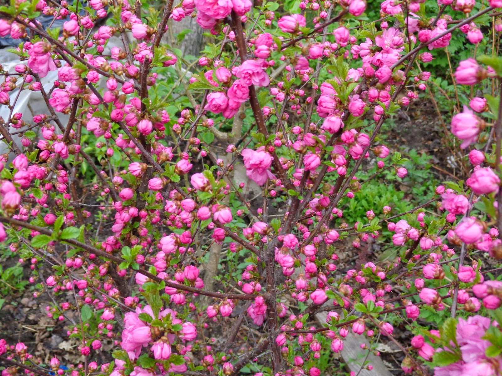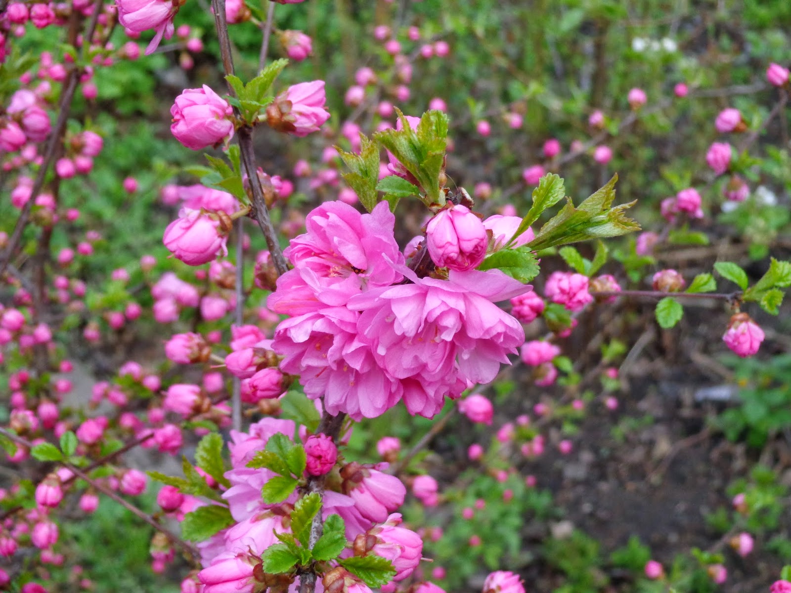 Оживая, сакура покрывается множеством розовых шариков, при этом нет еще ни намека на зелень листочков. Медленно набирая насыщенный цвет и объём, они постепенно делают невидимыми ветви куста, и однажды замечаешь, что уже и листочки развернулись. Их форма необычно рельефна, а пластинка напоминает жатый шёлк.